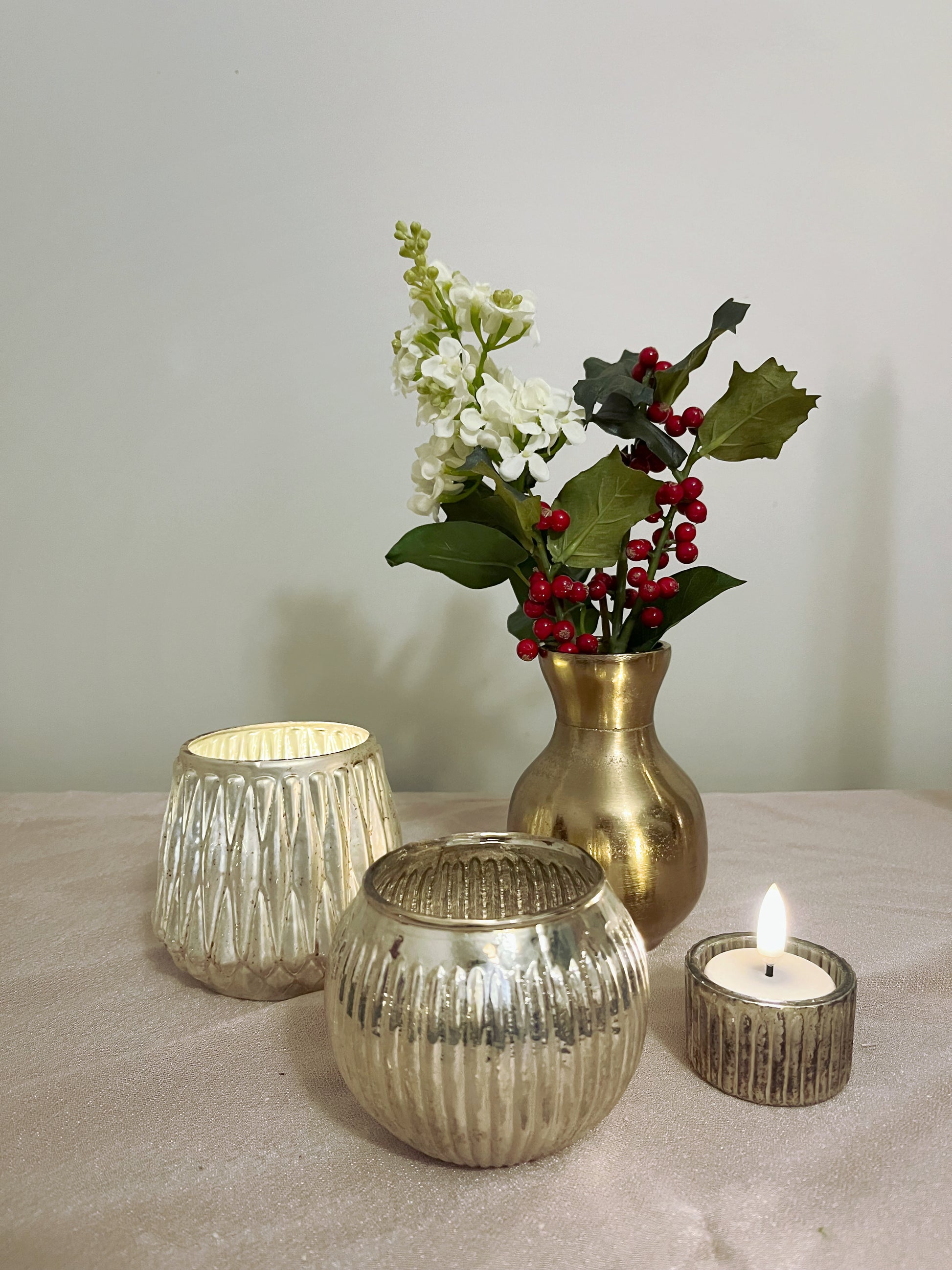 Create a warm, inviting ambiance with this set of three LED votive candles, each in a different style and size. Perfect for scattering around your table, these flickering votives add dimension and charm while complementing your holiday décor seamlessly.